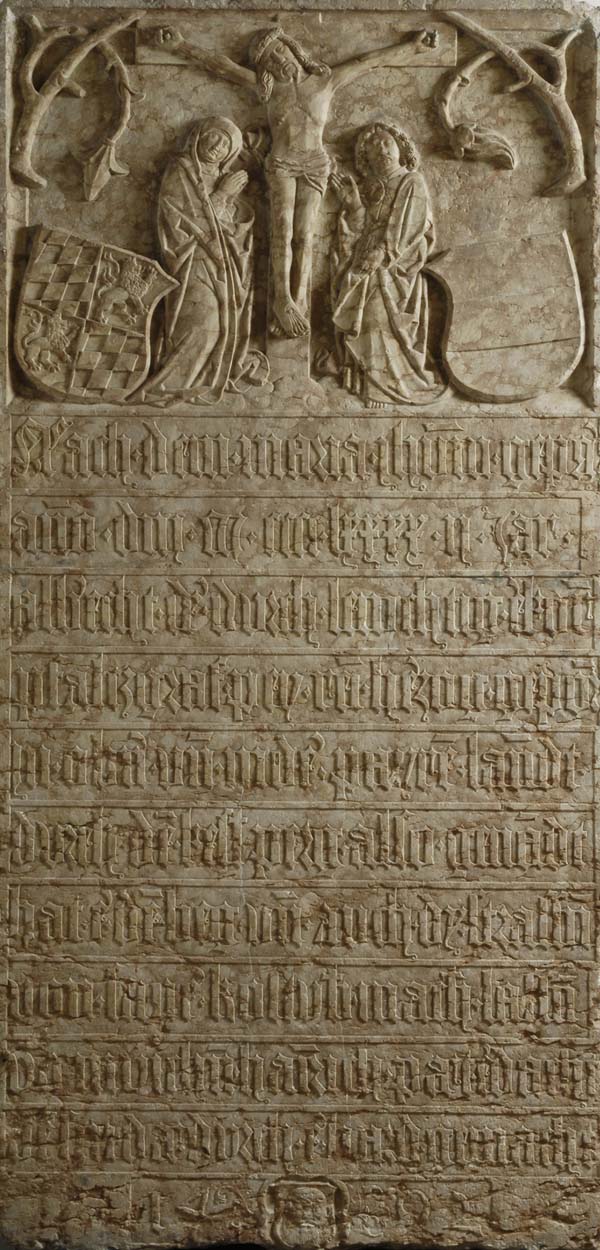 Rotmarmorstein zur Erinnerung an den Ausbau der Kesselbergstraße durch Herzog Albrecht IV. (Original heute im Bayerischen Nationalmuseum, vor Ort eine Kopie). Die Kreuzigungsdarstellung wird von den Wappen des Herzogs (li.) und seiner Gattin Kunigunde von Österreich (re., 1465-1520) gerahmt. Am Fuß des Steins die Datierung (1492) mit dem stark beschädigten Wappen der Patrizierfamilie Barth in der Mitte. (Foto: Bayerisches Nationalmuseum München, Inv. Nr. L 62/48)