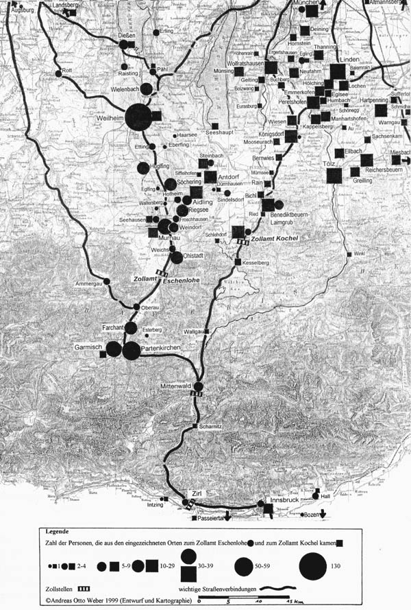 Herkunft der Händler und Transporteure in den Zollrechnungen von Eschenlohe und Kochel 1478 bzw. 1493. Quadrate zeigen die Herkunftsorte der Personen an, die über den Kesselberg handelten, Kreise dagegen markieren die Heimatorte der über Eschenlohe reisenden Händler. (Karte: Andreas Otto Weber; aus: Hans-Dirk Joosten/Christoph Kürzeder (Hg.), Via Claudia - Stationen einer Straße: 2000 Jahre unterwegs zwischen Zirl und Partenkirchen, Großweil 2000, 42)