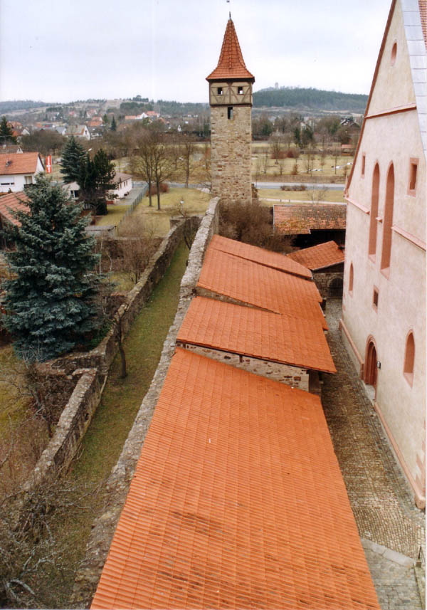 Ostheim v. d. Rhön (Lkr. Rhön-Grabfeld). Kirchenburg. Westseite mit Nordwestturm, Zwinger und Gaden. (Foto: Joachim Zeune 2006)