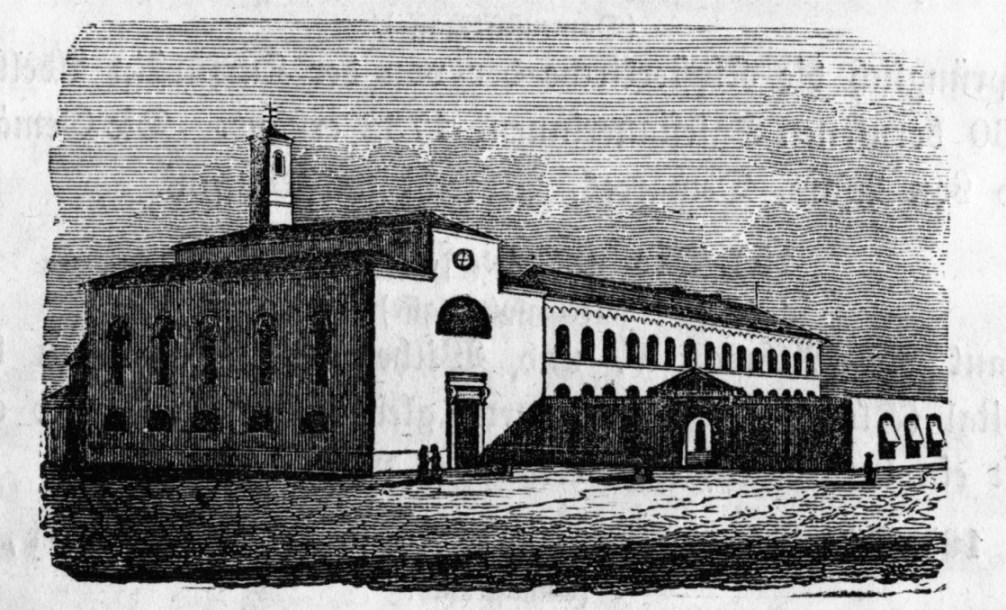 Ansicht von St. Jakob am Anger in München, Holzschnitt von 1845. (Bayerische Staatsbibliothek München, Portrait- und Ansichtensammlung)