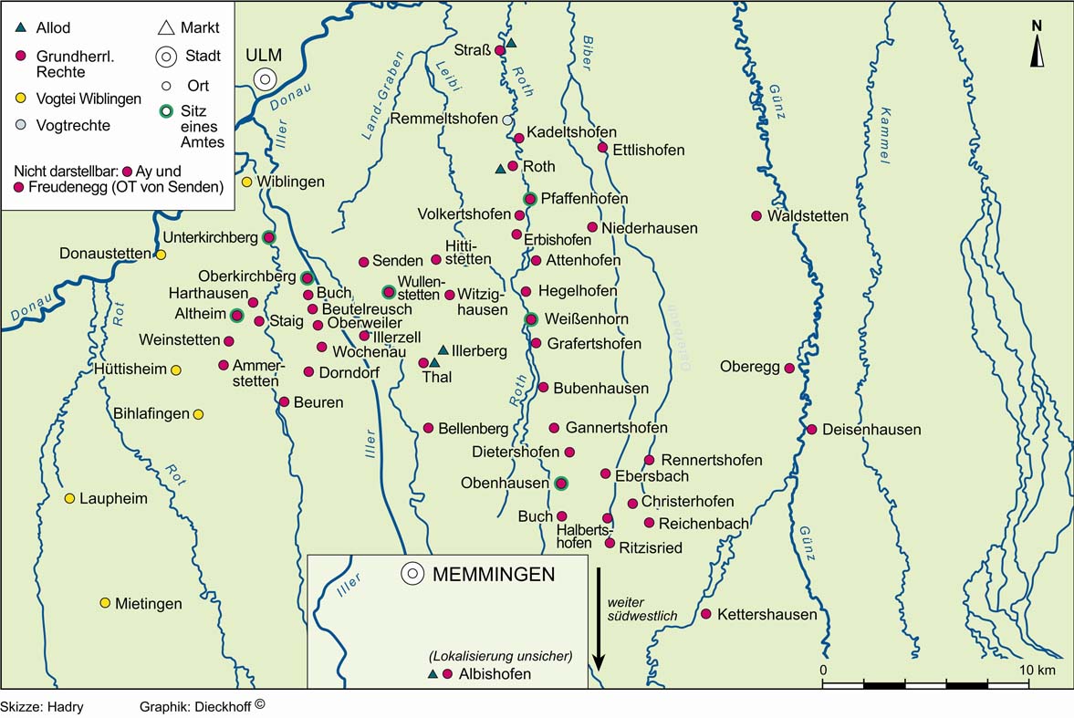 Der Grundbesitz der Herrschaft Kirchberg-Weißenhorn mit Vogtei Wiblingen, um 1490. (Entwurf: Hadry, Graphik: Dieckhoff)