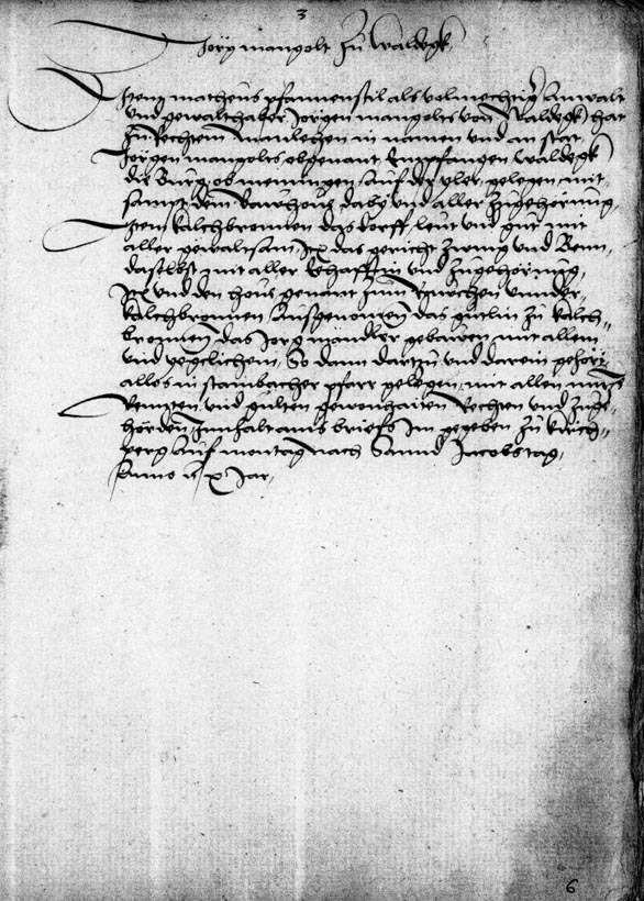 Das Lehenbuch Jakob Fuggers (Laufzeit 1510-1525) für die Grafschaft Kirchberg. Hier: Belehnung Jörg von Mangolds mit Burg Waldeck (abg.) und Dorf Kaltbronn (Gde. Legau, Lkr. Unterallgäu) inkl. aller Leute und Güter, Gericht, Zwing und Bann sowie Ehaften und sonstigem Zubehör. Die Ortsangabe "Steinbacher Pfarrei" bezieht sich auf Maria Steinbach bei Legau. (Staatsarchiv Augsburg, Fugger II, MüB 16, hier fol. 3)