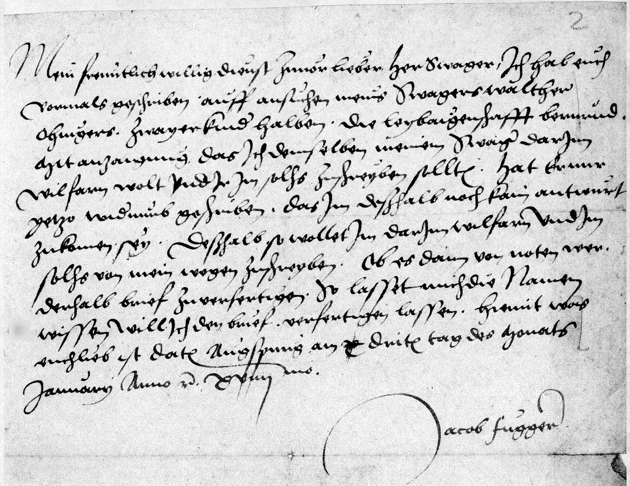 Weisung Jakob Fuggers an seinen Kirchberger Pfleger vom 3.1.1519. Zum Inhalt: Im Dorf Balzheim (Ortsherr: Walter Ehinger, ein Ulmer Patrizier) war 1518 eine kirchbergische Leibeigene verstorben und hatte zwei Kinder hinterlassen. Ehinger hatte daraufhin bei Jakob Fugger betr. der zukünftigen Versorgung der Waisen angefragt und ihn gebeten, die Verhältnisse prüfen zu lassen (Jakob war schließlich der Leibherr der Kinder). Im vorliegenden Schreiben beauftragt Jakob Fugger seinen Beamten zu Kirchberg, Ehingers Anliegen nachzukommen und ihm dann darüber zu berichten (Jakob schrieb solche Weisungen übrigens nicht selbst, sondern diktierte sie seinem Schreiber). (Fuggerarchiv, 27.3.14g)