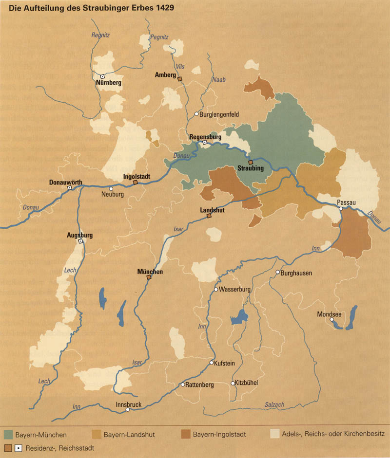 Die Aufteilung des Straubinger Erbes 1429. (in: Suzanne Bäumler/Evamaria Brockhoff/Michael Henker [Hg.], Von Kaisers Gnaden. 500 Jahre Pfalz-Neuburg [Veröffentlichungen zur Bayerischen Geschichte und Kultur 50], Augsburg 2005in: Bäumler/Brockhoff/Henker, Von Kaisers Gnaden, 2005, 45)