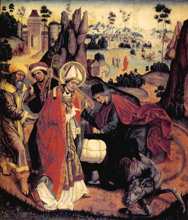 Das Bärenwunder des hl. Korbinian, Gemälde von Jan Pollack (gest. 1519). Die Darstellung aus dem Jahr 1489 zeigt den Heiligen auf seiner Romreise bei der Querung der Alpen - ebenfalls als Fußreisenden. Korbinian belädt den Bären, der das Packpferd der Reisegruppe gerissen hatte, mit dem Gepäck. Im Hintergrund sperrt eine Burg das Tal. (Leihgabe der Bayerischen Staatsgemäldesammlungen im Diözesanmuseum Freising)