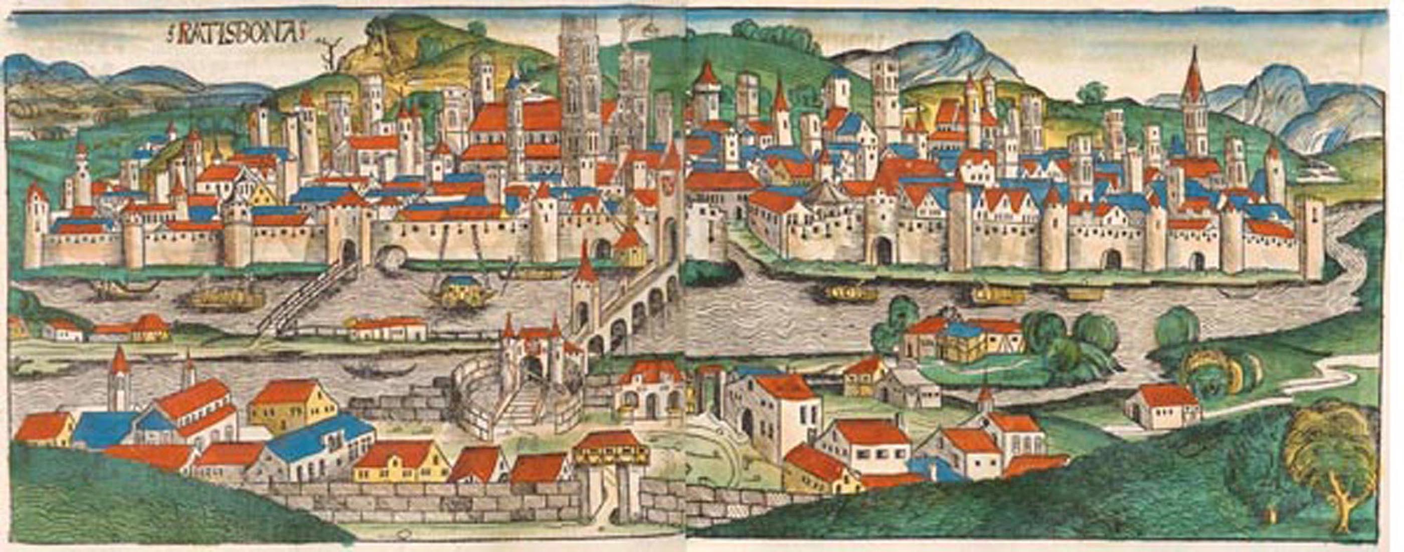 Ansicht von Regensburg aus der Schedelschen Weltchronik. Die Abbildung zeigt nicht nur die weltberühmte Steinerne Brücke, sondern auch Flöße und Schiffe. (BSB Rar. 287 fol. 97v-98r. Privates Exemplar des Hartmann Schedel)
