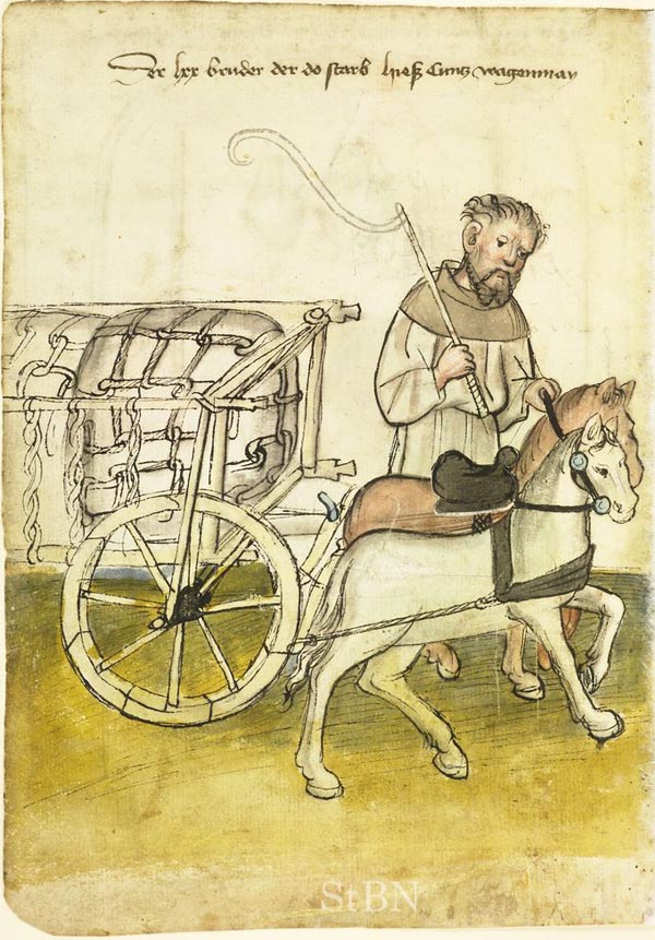 Darstellung eines Fuhrmanns im Hausbuch der Mendelschen Zwölfbrüderstiftung in Nürnberg aus der Zeit um 1425. (Stadtbibliothek Nürnberg Amb. 317.2°, fol. 32v)