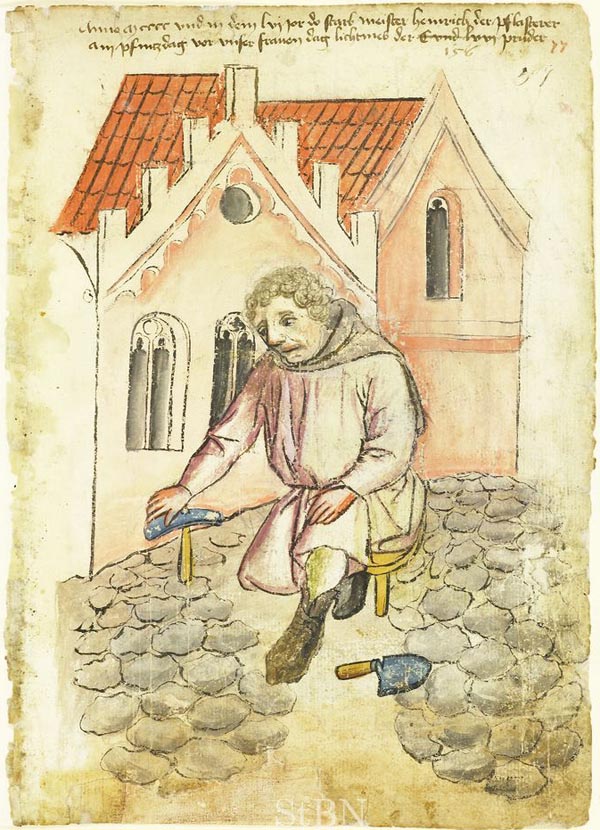 Darstellung eines Pflasterers im Hausbuch der Mendelschen Zwölfbrüderstiftung in Nürnberg von 1465. (Stadtbibliothek Nürnberg Amb. 317.2°, fol. 77r)
