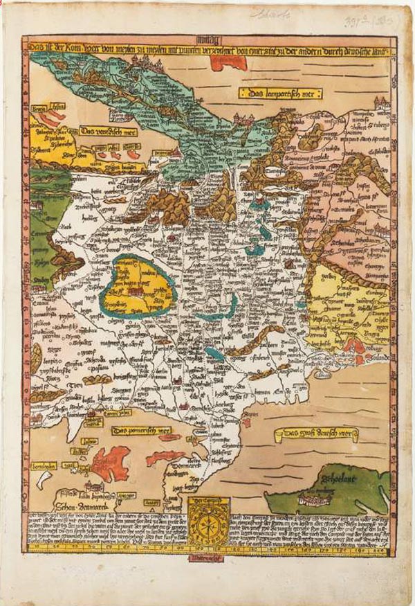 Die Romwegkarte von Erhard Etzlaub (1462-1532), die älteste gedruckte Wegekarte Mitteleuropas, richtete sich bezeichnenderweise an Pilger. Sie entstand für das Heilige Jahr 1500. (BSB Rar. 287#Beibd.4 aus dem Besitz von Hartmann Schedel)
