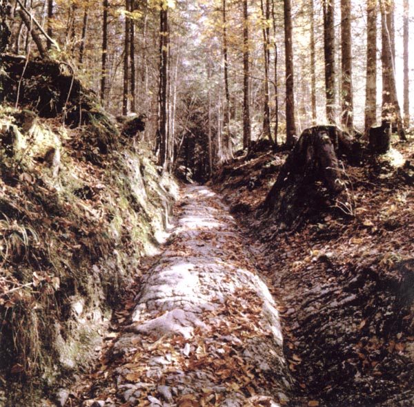 Geleisstrecke bei Klais (Gde. Krün, Lkr. Garmisch-Parftenkirchen), vermutlich ein Bestandteil der römischen Via Claudia. Geleisstraßen erleichterten die Talfahrt in Gebirgsgegenden. (Bayerisches Landesamt für Denkmalpflege)