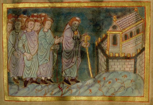 Ankunft des hl. Kilian in Würzburg. Der wohl aus Irland stammende Bischof erreicht seinen Wirkungsort in der ältesten bildlichen Darstellung vom Ende des 10. Jahrhunderts zu Fuß. Dies dürfte wohl der frühmittelalterlichen Praxis entsprechen. (Gottfried Wilhelm Leibniz Bibliothek - Niedersächsische Landesbibliothek Hannover, Ms I 189, fol. 2r)