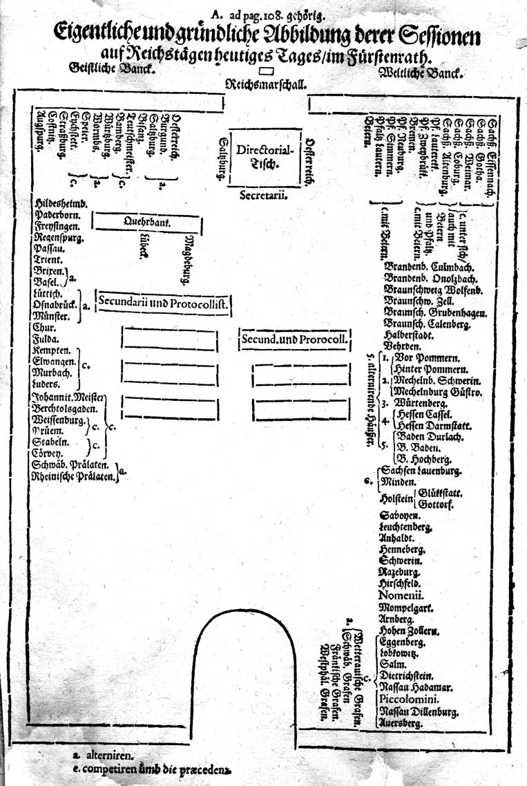 Sitzordnung des Fürstenrats im Reichstag (die Kennzeichnung des schwäbischen und rheinischen Kollegiums als alternierend ist unrichtig). (aus: Rudolph Heiden, Grundfeste des Heil. Römischen Reichs Teutscher Nation / Aus dem 8. Artic. des Oßnabrükkischen Friedenschlusses vorgestellt, Frankfurt 1660)