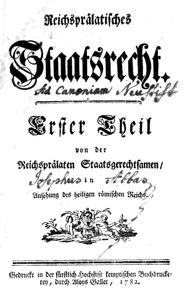 Titelblatt des "Reichsprälatischen Staatsrechts". (Willebold Held, Reichsprälatisches Staatsrecht. 1. Band, Kempten 1782)