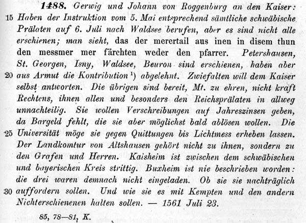Schreiben der schwäbischen Reichsprälaten an den Kaiser, 1561 - als Regest. (aus: Heinrich Günter [Bearb.], Gerwig Blarer. 2. Band, Nr. 1488)