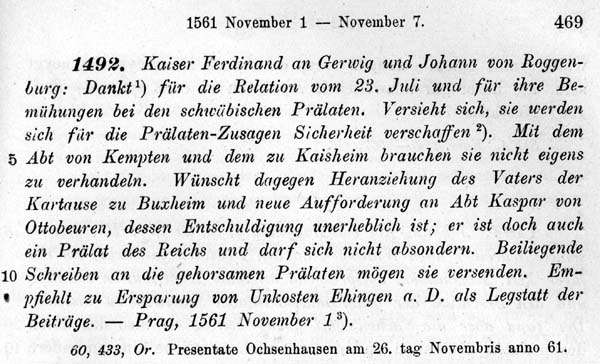 Antwortschreiben des Kaisers an die schwäbischen Reichsprälaten, 1561 - als Regest. (aus: Heinrich Günter [Bearb.], Gerwig Blarer. 2. Band, Nr. 1492)