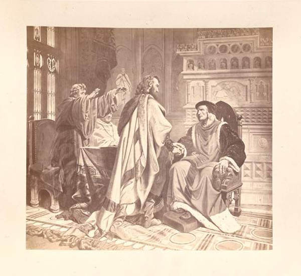 Versöhnung Albrechts III. mit seinem Vater nach der Ermordung der Agnes Bernauer 1435. Wandbild im Gebäude des 1867 eröffneten Bayerischen Nationalmuseums (heute: Museum Fünf Kontinente). (aus: Karl von Spruner Die Wandbilder des Bayerischen National-Museums. Band IV, München, 1868, Tafel 39. Abbildung aus dem Exemplar, das König Ludwig II. der Bayerischen Staatsbibliothek schenkte. [BSB Rar. 106])