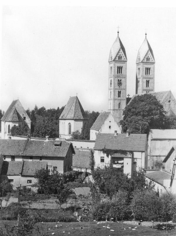 Die Agnes-Bernauer-Kapelle (Mitte) im Friedhof der Straubinger Pfarrkirche St. Peter (re.). Links die Totenkapelle von 1486. Foto um 1920. (Foto: Gäubodenmuseum Straubing)