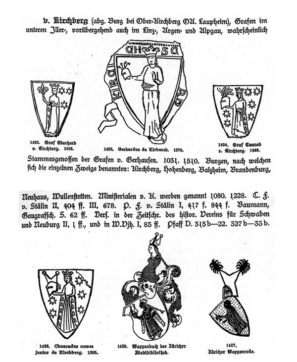 Wappendarstellungen der Grafen von Kirchberg. (aus: Württembergisches Adels- und Wappenbuch, i. A. des Würrtembergischen Altertumsvereins begonnen von Otto v. Alberti, fortgesetzt von Friedrich Gaisberg-Schöckingen u. a., 16 Hefte, Stuttgart 1889-1916, 400-401)