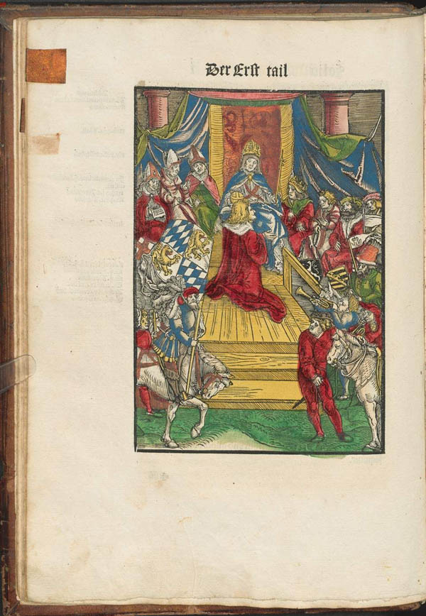 Ein bayerischer Herzog wird vom Kaiser belehnt. Holzschnitt von Meister H. F. (aus: Der neü Layenspiegel, 1512, Bayerische Staatsbibliothek, Rar. 2311)