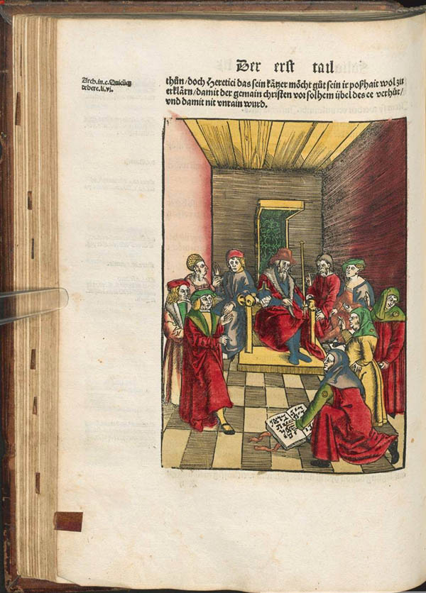 Judeneid vor Gericht, Holzschnitt von Meister H. F. Der Schnitt ist sehr viel kunstvoller gestaltet als in den Straßburger "Raubdrucken". (aus: Der neü Layenspiegel, 1512, Bayerische Staatsbibliothek, Rar. 2311)