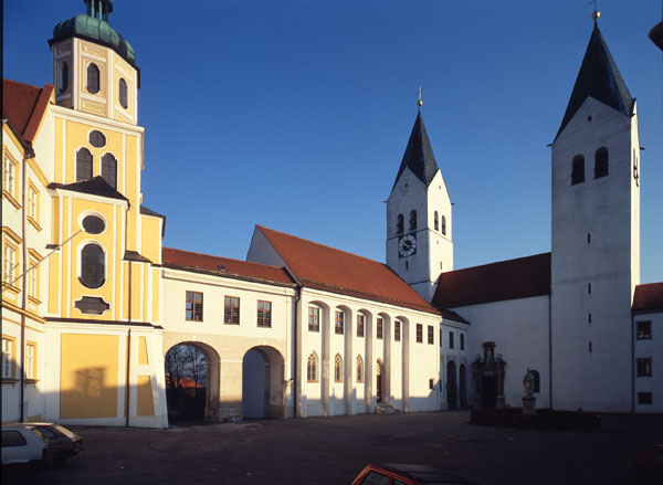 Blick in den Domhof und auf die Hauptfassade des Freisinger Doms. (Foto: Erzbischöfliches Ordinariat München, Hauptabteilung Kunst, Wolf Christian von der Mülbe)