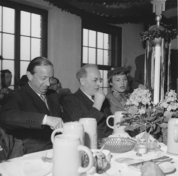 Werner Friedmann (1909-1969) und Wilhelm Hoegner (1887-1980) in der Münchner Gastwirtschaft "Paulaner am Nockherberg", Salvatoranstich 8.3.1952. (Bayerische Staatsbibliothek, Fotoarchiv Timpe)