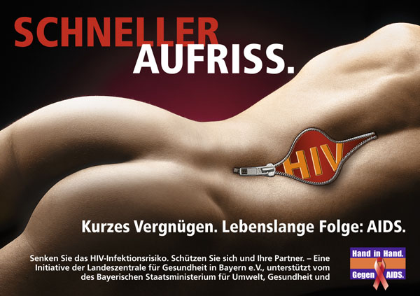 Kampagne "Schneller Aufriss. Kurzes Vergnügen, lebenslange Folge: AIDS", 2007. (Kommunikationsagentur Schultze. Walther. Zahel. GmbH)