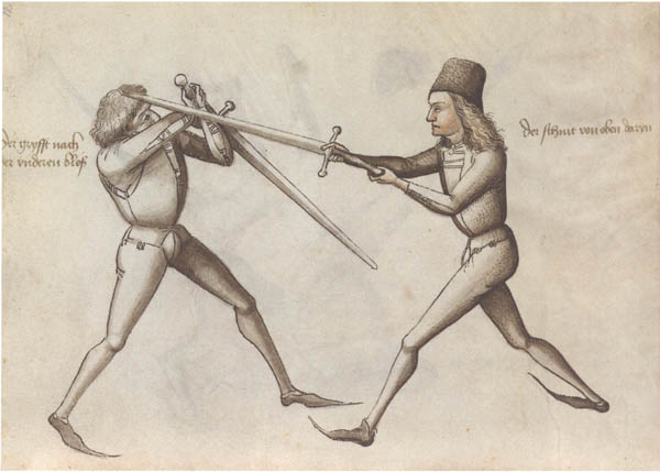 Fechtkampf mit dem Schwert. (Fechtbuch des Hans Talhofer, 1467; Bayerische Staatsbibliothek, Cod. Icon 394a, fol. 12r)