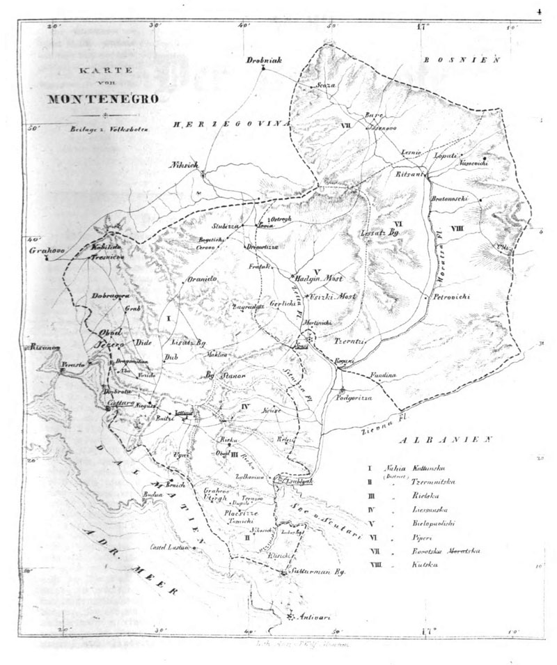Karte von Montenegro. Dem Abdruck der Karte waren in den Tagen zuvor einige Berichte und Meldungen über die Entwicklungen in Montenegro vorangegangen. Abb. aus: Der Volksbote für den Bürger und Landmann. Beiwagen, 1853, Nr. 6, 13. Februar 1853. (Bayerische Staatsbibliothek 4 Eph.pol.42-1853)