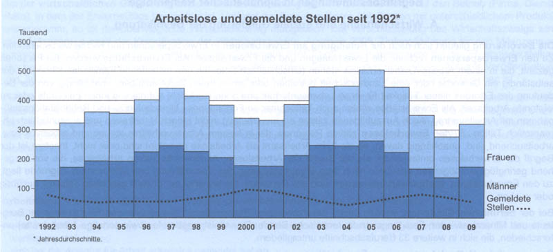 Arbeitslose und gemeldete Stellen seit 1992. (Quelle: © Bayerisches Landesamt für Statistik und Datenverarbeitung, München, 2010, 173)