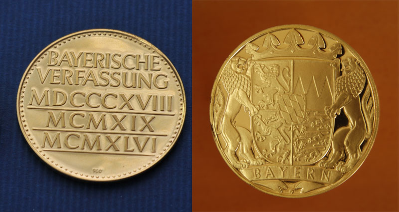 Bayerische Verfassungsmedaille in Gold, Vorder- und Rückseite. (Fotograf Rolf Poss, Bildarchiv Bayerischer Landtag)