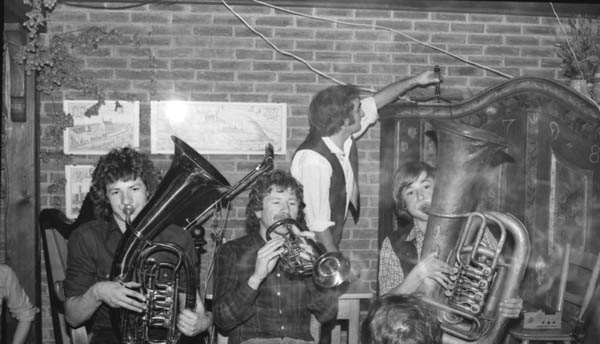 Biermösl-Blosn mit Kabarettist und Schauspieler Sigi Zimmerschied (geb. 1953) beim Hörbacher Montagsbrettl 1979. (Foto: Sammlung T. Drexler)