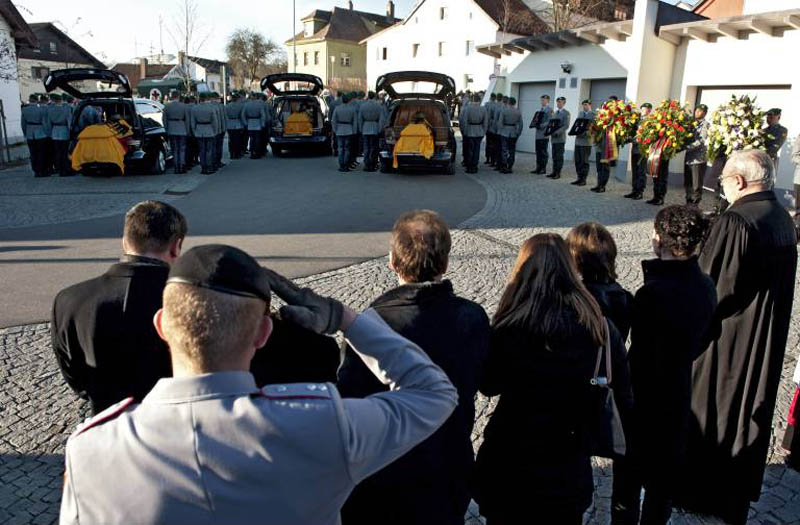 EEin Bundeswehrsoldat salutiert am Freitag (25. Februar 2011) in Regen nach der zentralen Trauerfeier für die drei am Freitag (18. Februar 2011) in Afghanistan gefallenen Soldaten, während Soldaten des Wachbatallions die Särge der Gefallenen in Leichenwagen abgestellt haben. Die Männer kamen bei einem Angriff eines Soldaten der afghanischen Nationalarmee ums Leben. (Foto: imago stock & people GmbH)