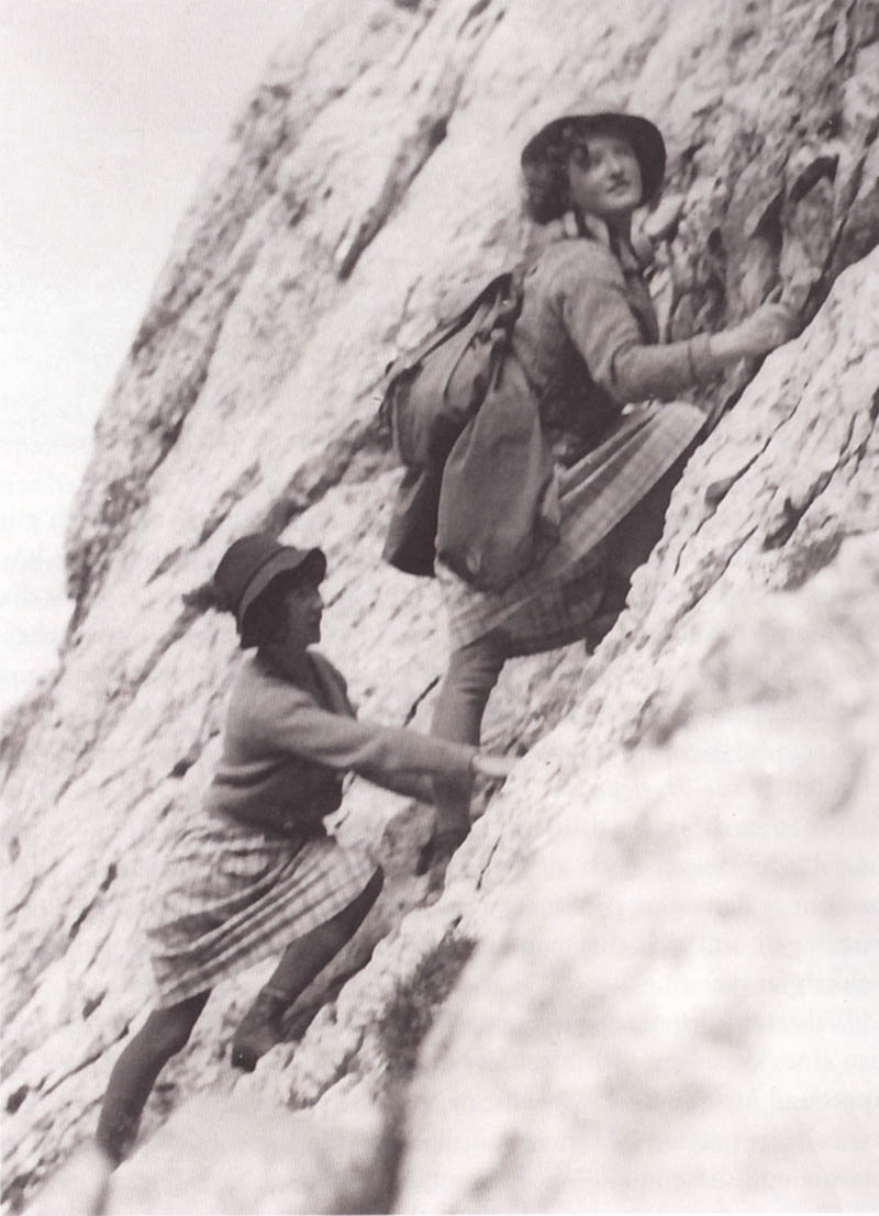 Die Ausrüstung der Alpinisten zu Beginn des 20. Jahrhunderts mutet aus heutiger Perspektive zuweilen abenteuerlich an, wie dieses Bild zweier Damen von 1938 zeigt. Aus dem Fotoalbum von Isolde Paur. (Archiv des Deutschen Alpenvereins, München)