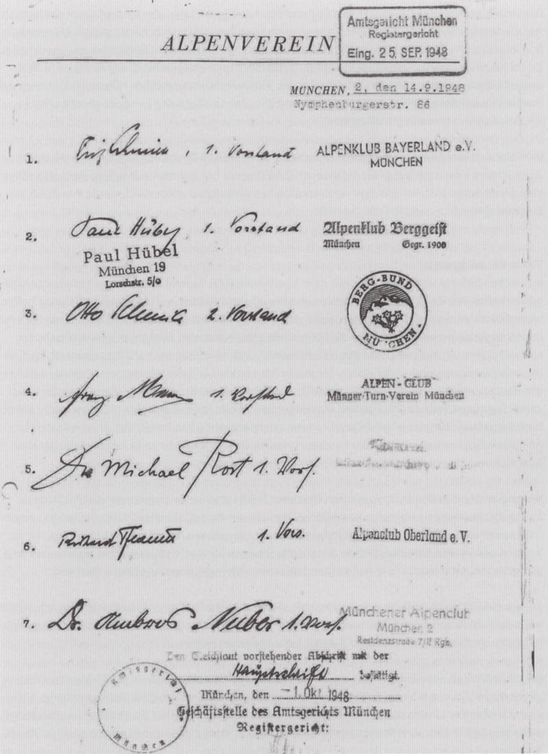 Gründungsurkunde des Deutschen Alpenvereins von 1948. Nach dem Zweiten Weltkrieg musste sich auch der Alpenverein neu gründen. (Archiv des Deutschen Alpenvereins, München)
