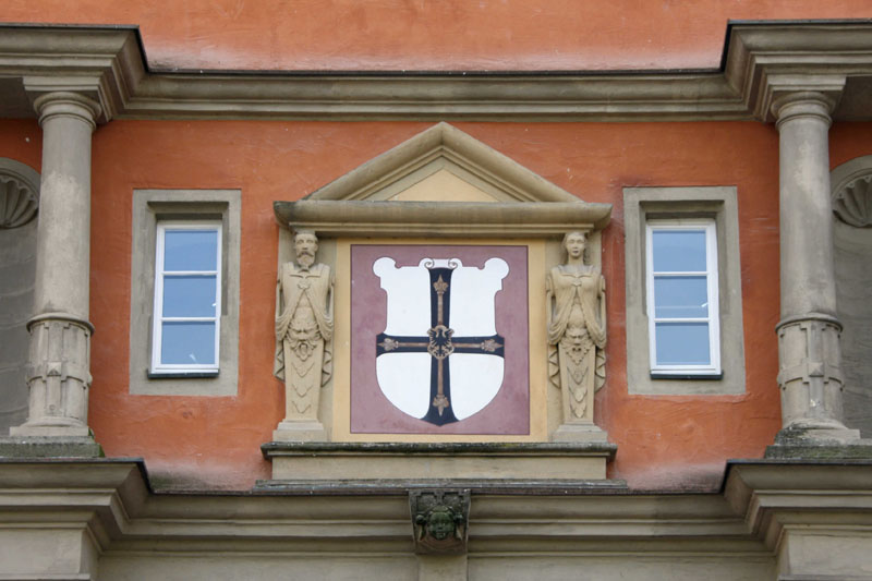 Wappenschild des Deutschen Ordens über dem Torbogen des Deutschordensschlosses in Bad Mergentheim. Das Schloss war 1526-1809 Sitz der Hoch- und Deutschmeister des Deutschen Ordens. Aufnahme 2009. (Foto von Schorle lizensiert durch CC BY-SA 3.0 via Wikimedia Commons)