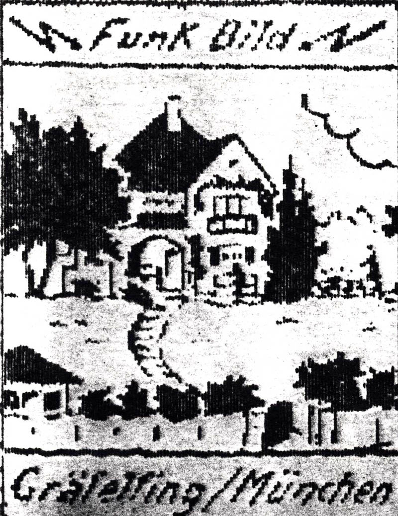 Das erste Funkbild der Drahtlostelegraphischen und Luftelektrischen Versuchsstation Gräfelfing (DVG) von Prof. Max Dieckmann (1882-1960). Das Bild zeigt Dieckmanns Villa in der heutigen Professor-Kurt-Huber-Straße in Gräfelfing. Dieckmann stellte seinen Funkbildapparat 1925 fertig. Mithilfe des Apparates strahlte u. a. die Bayerische Landeswetterwarte Wetterkarten aus. Die Übertragung eines 13 x 18 cm großen Bildes dauerte zwischen vier und fünf Minuten. (Foto: Gemeindearchiv Gräfelfing)