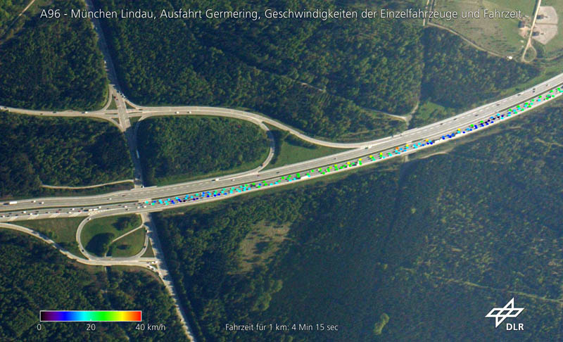 Stau auf der A96 (Lindau-München) mit berechneter Reisezeit. Dieses Bild wurde während des Sommerreiseverkehrs im August 2006 im Rahmen der DLR/ADAC-Kampagne zum großflächigen Verkehrsmonitoring zur Erfassung von Stauzeiten aus digitalen Serienbildern erstellt. Das Kamerasystem besteht aus drei kommerziell erhältlichen 16MPix Kameras (3K-Kamera). Mit ihm kann bei jeder Aufnahme ein Gebiet von ca. sieben mal zwei Kilometern abgedeckt werden. Die mit mathematischen Methoden im Rahmen der Kampagne ermittelten Stauzeiten wurden mit den Reisezeiten verglichen, die von ADAC-Fahrzeugen gemessen wurden, die gleichzeitig am Verkehr teilnahmen (siehe auch Pressemitteilung vom 14. August 2006). (Foto: Deutsches Zentrum für Luft- und Raumfahrt e.V.)