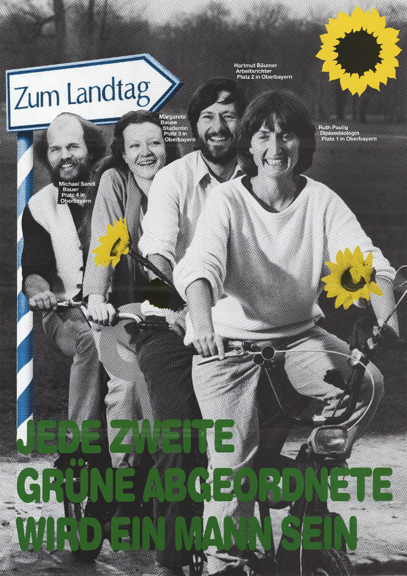 Wahlplakat für die bayerische Landtagswahl 1986: "Zum Landtag. Jede zweite grüne Abgeordnete wird ein Mann sein". (Foto: Bündnis 90/Die Grünen Landesverband Bayern)