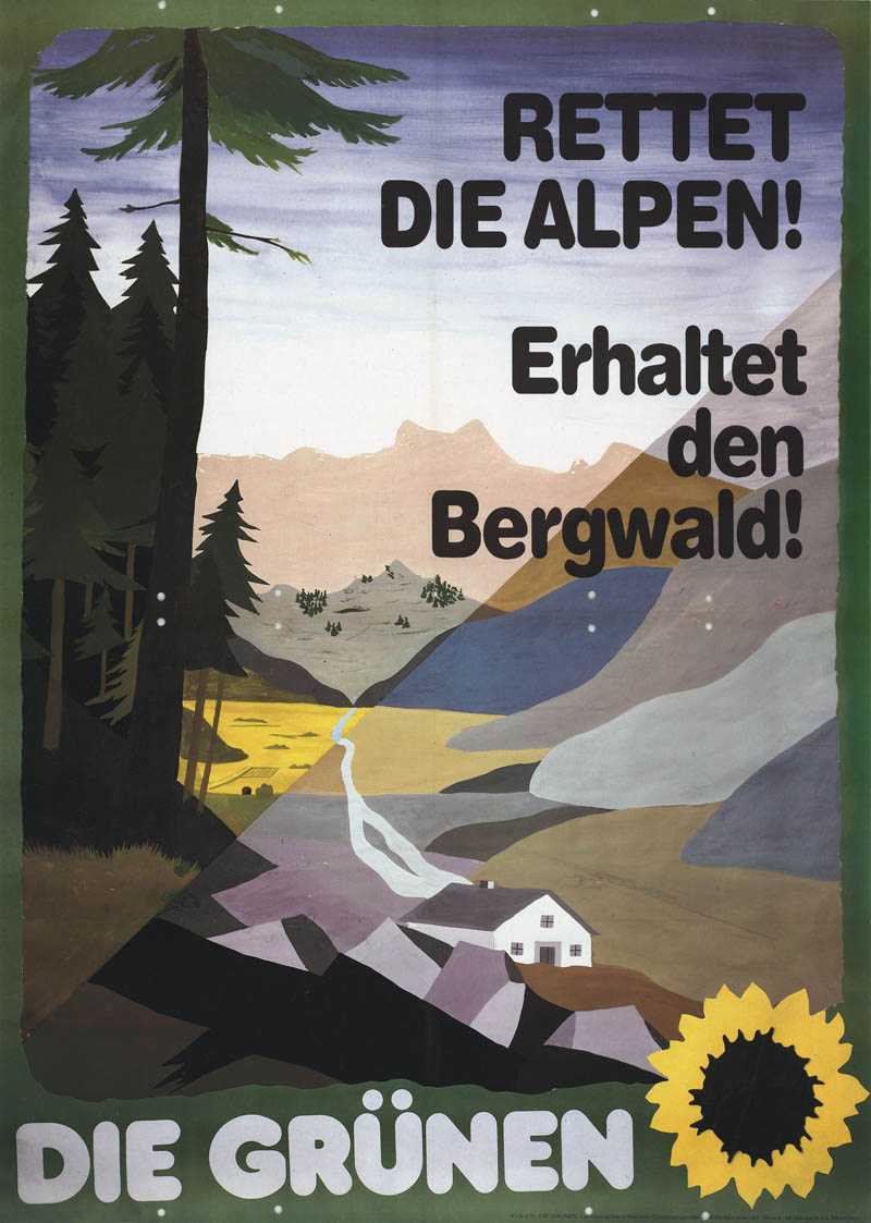 Wahlplakat für die Landtagswahl 1986: "Rettet die Alpen! Erhaltet den Bergwald!" Der Wahlslogan aus dem Jahr 1985 macht auf die Bedrohung der Wälder im Allgemeinen und - speziell in Bayern - des Bergwalds im Besonderen durch den sauren Regen aufmerksam. (Foto: Bündnis 90/Die Grünen Landesverband Bayern)