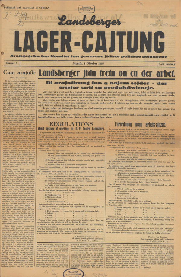 Landsberger Lager Cajtung, Erstausgabe Montag, 8. Oktober 1945. (Bayerische Staatsbibliothek, 2 Z 49.2-1/2)