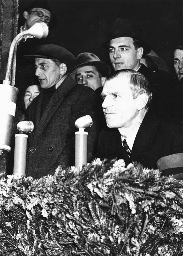 Der ehemalige, für die Entnazifizierung in Bayern zuständige Sonderminister Alfred Loritz (WAV, 1902-1979) bei einer Kundgebung auf dem Königsplatz in München, 12.12.1948 (vorne rechts). (Bayerische Staatsbibliothek, Fotoarchiv Hoffmann)