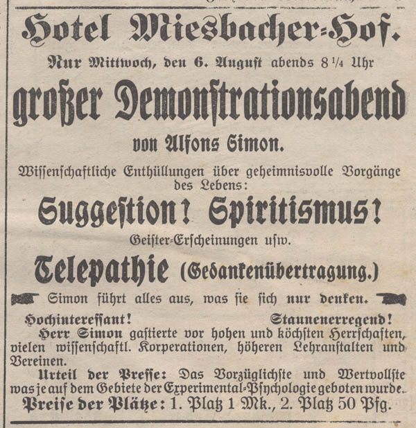Ankündigung eines esotorischen Demonstrationsabends 1913. (Miesbacher Anzeiger vom 5. August 1913)