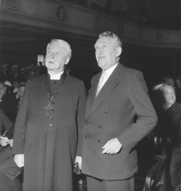 Bischof Hans Meiser (1881-1956) zusammen mit Josef Singer (CSU, 1888-1980, 1947-1967 Präsident des Bayerischen Senats) auf dem 482. Stiftungsfest der Ludwig-Maximilians-Universität München am 3. Juli 1954. (Bayerische Staatsbibliothek, Bildarchiv timp-013389)