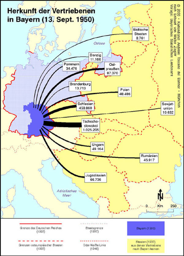 Herkunft der Vertriebenen in Bayern (Stand: 13.9.1950). (© 2000 Kartendienst Andreas Toscano del Banner, München, Vorlage: Walter Ziegler)