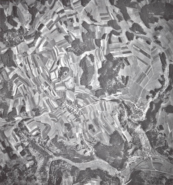 Luftbild der Gemarkung Siegritz in der Fränkischen Schweiz vor der Flurbereinigung, 1963. Gut zu erkennen sind die zahlreichen und kleinteiligen landwirtschaftlichen Flächen. (in: Philipp Hümmer/Hans-Joachim Schneider, 75 Jahre Direktion für Ländliche Entwicklung Bamberg. Flurbereinigung im Wandel der Zeit, Bamberg 1998, 38)