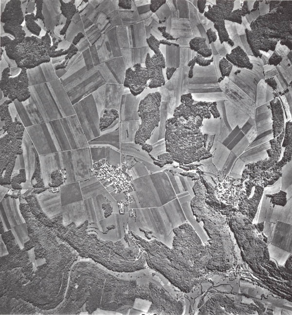 Luftbild der Gemarkung Siegritz in der Fränkischen Schweiz nach der Flurbereinigung, 1996. Im Unterschied zu 1963 sind die kleinteiligen Strukturen der landwirtschaftlichen Flächen fast gänzlich verschwunden. (in: Philipp Hümmer/Hans-Joachim Schneider, 75 Jahre Direktion für Ländliche Entwicklung Bamberg. Flurbereinigung im Wandel der Zeit, Bamberg 1998, 39)