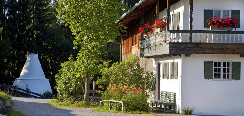 Freilichtmuseum Glentleiten: Hof aus Altenbeuern (Lkr. Rosenheim), Hausname "Bachl" (Erbauungsjahr 1769, Präsentationsjahr 1950). Im Hintergrund die Kopie eines Kalkofens aus Lenggries (Lkr. Bad Tölz-Wolfratshausen). Der Blumenschmuck am Hof lässt das Ausstellungsobjekt nicht als steriles museales Objekt erscheinen, sondern veranschaulicht dem Besucher eine für die Jahreszeit typische und potentiell reale Momentaufnahme. (Foto: Archiv FLM Glentleiten)