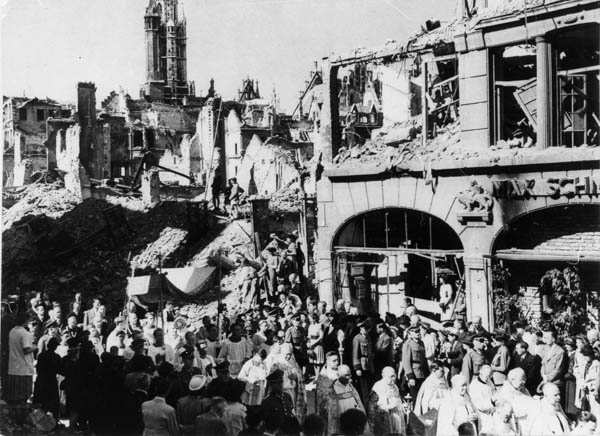 Die Fronleichnamsprozession in der Residenzstraße, mit Blick auf das zerstörte Viertel nördlich des Neuen Rathauses (heute: Marienhof). (Foto: Bayerische Staatsbibliothek, Fotoarchiv Hoffmann)