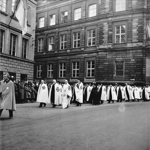 Ritter vom Hl. Grab bei der Beisetzung des Münchner Erzbischofs Joseph Kardinal Wendel (1901-1960) am 6. Januar 1961. In der Mitte der ersten Reihe der Großpror und spätere Leiter der Deutschen Statthalterei des Ordens, Staatsminister Dr. Alois Hundhammer (1900-1974). (Bayerische Staatsbibliothek, Bildarchiv fruh-01484)